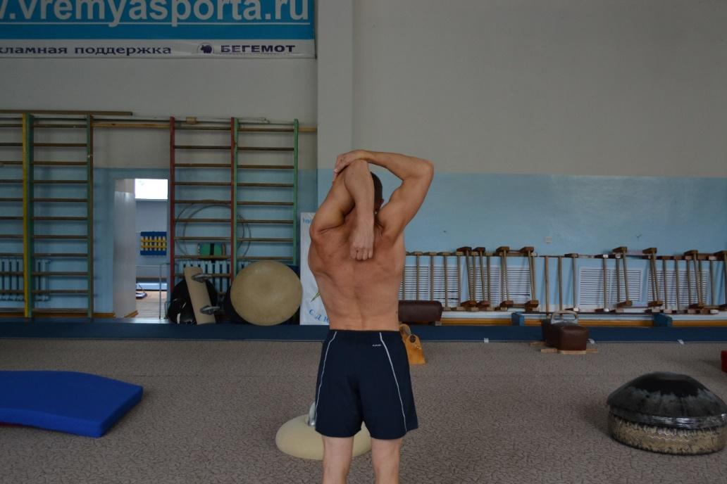 Изпълнява се с гимнастическа тояжка, по 20-40 секунди на всяка ръка. Ъгълът на сгъване на работещата ръка в лакътя трябва да бъде повече от 90 градуса.